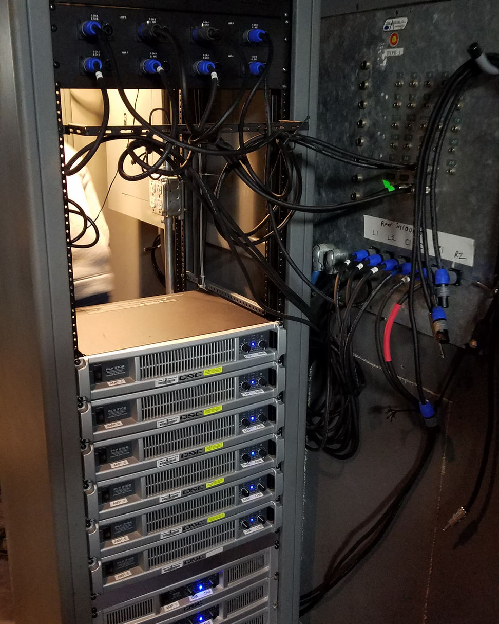 Studio Theatre Control Booth Remodel. With the gracious assistance and brilliant redesign by Jeff Sherwood, we completely gutted the current rack and split the equipment into two racks, the one rack being nothing but amplifiers and speaker patches. The old counters were removed and the floor taken up. I designed a new self supporting counter to accommodate Sound, Stage Management, Video Monitoring, Lights, and Projections (Watchout). The floor went back in with minor re-fitting and allowed for cable trough and management. Cat-5e was run backstage and in the house for video, ETC cue lights and networking. Not many can say they have a back up EOS, or a Yamaha CL5! THANKS SO MUCH, JEFF!